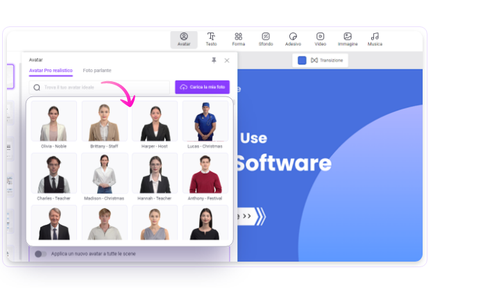 Scegli tra un'ampia gamma di avatar per narrare il tuo contenuto in modo coinvolgente.
