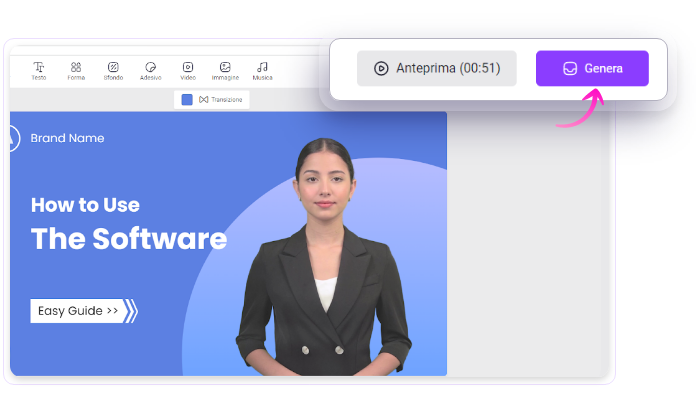 Quando sei soddisfatto, clicca su Genera per dare vita al tuo video. Scarica o condividi il tuo video sui social, o via email come vuoi.